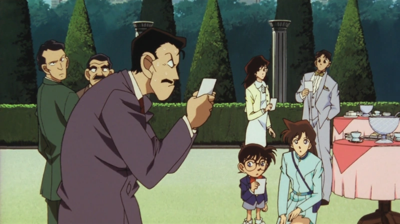 Conan tricks Kogoro into going to the tea party as Kogoro doesn't want to go in the first place. They meet Teiji Moriya and tell him that Shinichi couldn't make it but that Kogoro is another famous detective. Moriya gives everyone a quiz and asks them to solve it. Conan is the first to solve it, so he gets to go to see Moriya's gallery with Ran. While observing the pictures, Ran tells Moriya that she is going to the movies with Shinichi and is going to be watching it in one of the buildings he designed.